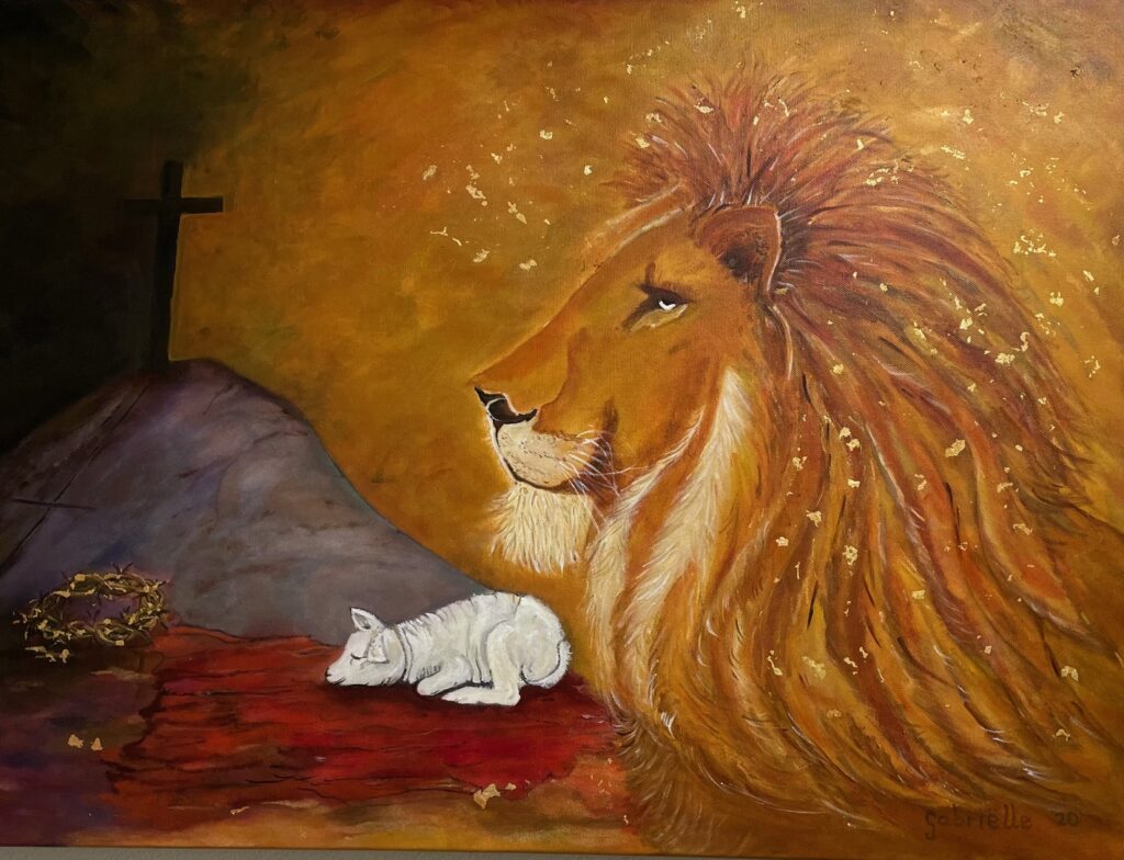 God of Jezus zelf, die tegelijkertijd ook Koninklijk is. Het goud in het schilderij symboliseert dat. De doornenkroon bij het kruis, die Jezus op Zijn hoofd kreeg ter bespotting dat hij de verwachte Koning was. Tegelijk heb ik ook daar goud in gebruikt, want Hij is wel degelijk de Koning. Het Lam dat symbool staat voor onschuldig en tegelijk omschreven wordt in Jesaja: